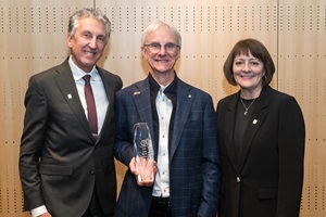 Denis Martel a reçu le prix Excellence – pht le 8 novembre 2025 à l’occasion de Physiothérapie 360°. Sur la photo, il est accompagné de Luc J. Hébert, président de l’OPPQ et de Chantal Besner, administratrice à l’OPPQ.