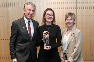 Lise Ferland a reçu le prix Excellence – T. phys. le 8 novembre 2025 à l’occasion de Physiothérapie 360°. Sur la photo, elle est accompagnée de Luc J. Hébert, président de l’OPPQ et de Geneviève Beaudoin, administratrice à l’OPPQ
