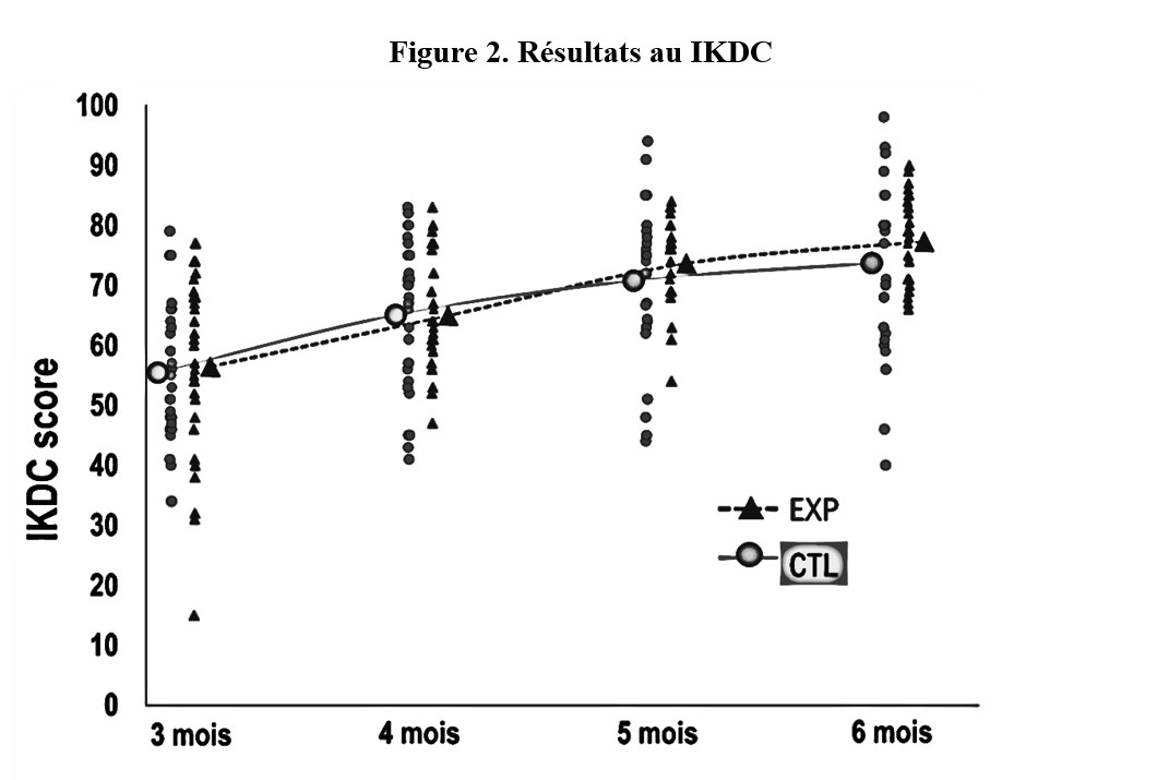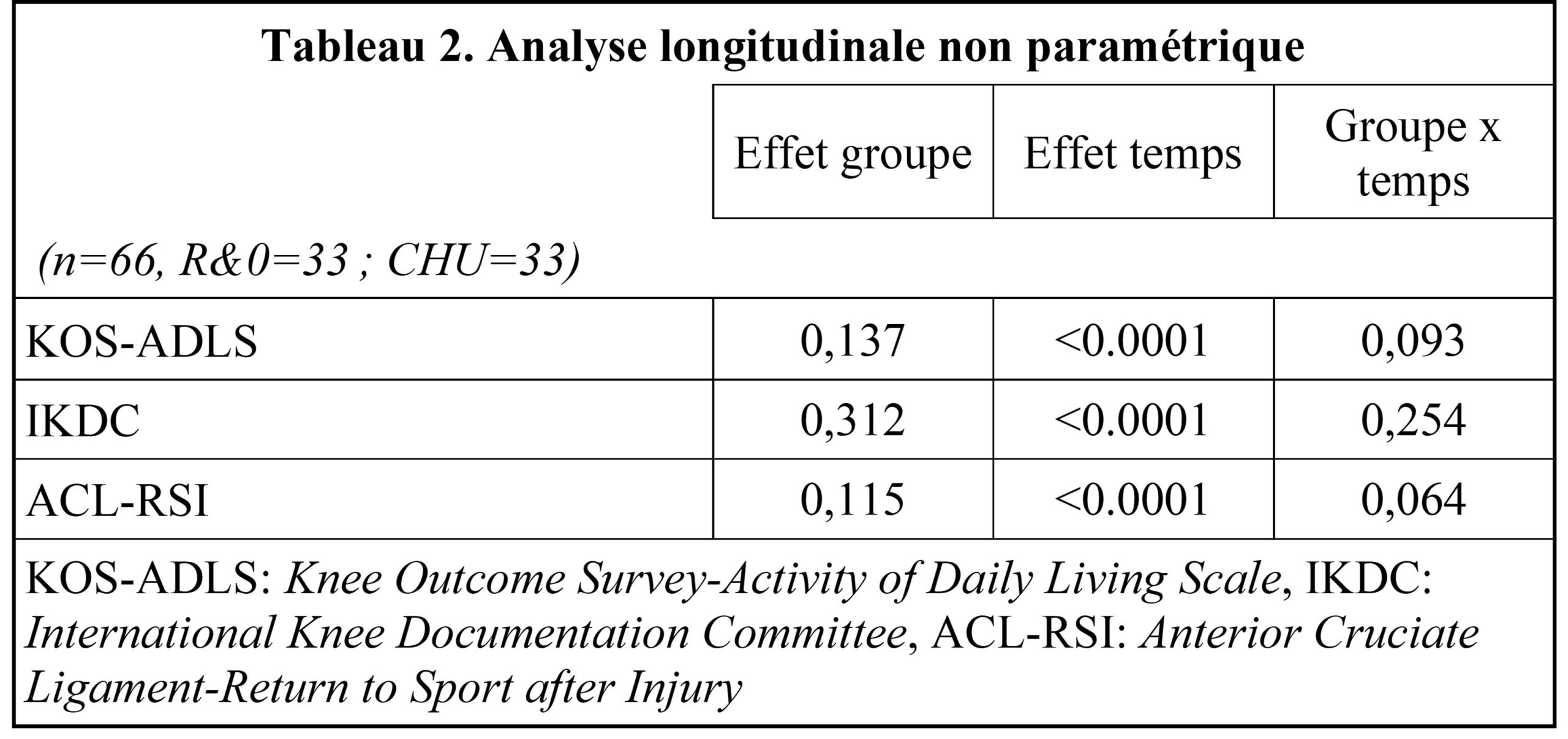 Pour comparer la différence au niveau des symptômes et des limitations fonctionnelles à trois, quatre, cinq et six mois entre les deux groupes, une analyse non paramétrique pour données longitudinales (nparLD ; Package 2.1 ; R software, version 3.3.3, 1.1.453) à mesures répétées a été utilisée. Le nparLD est la seule procédure qui permet de tenir compte d’un changement de distribution entre des groupes, et ce, à plusieurs temps de mesures(12). Une analyse à deux facteurs (2 groupes × 4 temps de mesure) nparLD a été utilisée pour comparer l’effet des interventions pour les questionnaires KOS-ADLS, IKDC et ACL-RSI.
