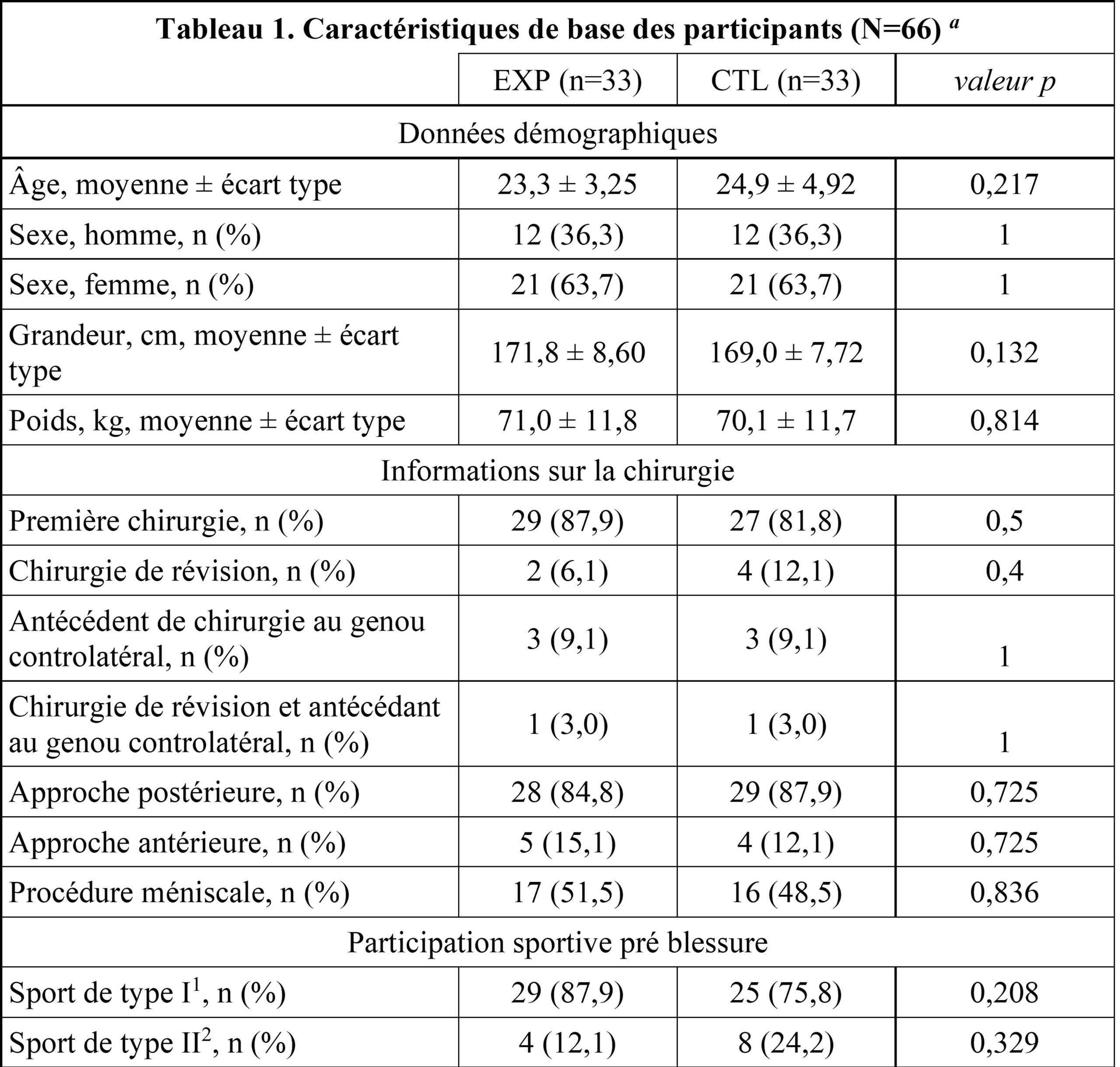 Les participants étaient inclus dans l’étude s’ils répondaient aux critères suivants: 1) être un athlète amateur à trois mois post-rLCA; 2) être âgé de 18 et 35 ans 3) s’adonner à la pratique sportive au minimum trois fois par semaine; 4) avoir subi une rLCA selon une approche antérieure (greffon à partir du tendon patellaire) ou postérieure (greffon des tendons du semi-tendineux et gracile); et 5) avoir un score de 85 % ou moins au questionnaire Knee Outcome Survey Activities of Daily Living Scale (KOS-ADLS) et/ou de 80 % ou moins au questionnaire International Knee Documentation Committee Subjective Knee Form (IKDC), confirmant ainsi un déficit fonctionnel minimal à l’entrée dans l’étude.