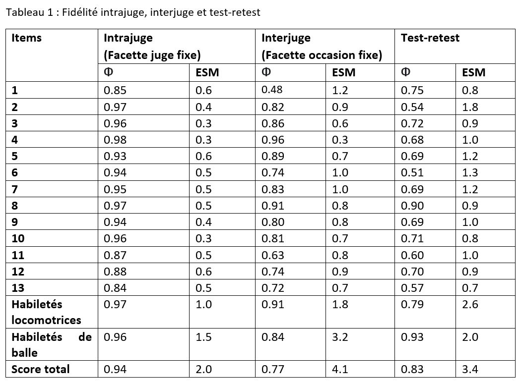 Dans le devis test-retest, la variance personne/occasion élevée observée s’explique par le fait que les enfants n’ont pas toujours donné la même performance aux deux sessions, comportement qui est fréquemment observé cliniquement avec la population TDC. Cette variabilité inter-essais plus élevée dans la production de mouvement chez les enfants atteints de TDC comparativement aux enfants avec développement typique reflète un schéma d’apprentissage atypique(14). Malgré cette variabilité de performance, la fidélité test-retest demeure bonne pour les sous-échelles et le score total (Φ: 0.79 à 0.93). Ces coefficients sont toutefois inférieurs à ceux obtenus par Webster et Ulrich (ICC entre 0.95 et 0.97) chez des enfants avec développement typique(6) indiquant une meilleure reproductibilité de la performance chez ces enfants comparativement aux enfants avec TDC. Pour obtenir une meilleure reproductibilité de la performance chez les enfants avec TDC, la TG démontre que la moyenne de deux évaluations devrait être utilisée (coefficients entre 0.88 et 0.96).