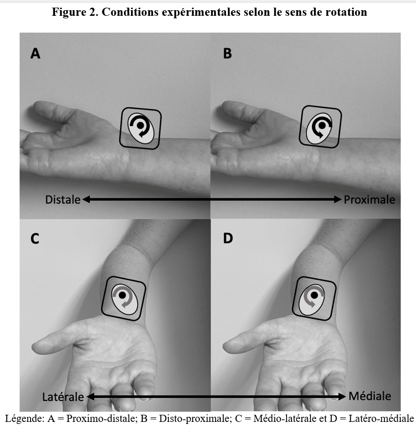 La Standardized Kinesthetic Illusion Procedure (SKIP)(5) a permis de standardiser et qualifier les perceptions en termes de clarté et de direction attendue sur des échelles ordinales. Quatre conditions différentes de rotation du moteur ont été testées, avec 3 essais de 10 secondes pour chacune d’entre elles par poignet, pour un total de 24 essais par personne. Les conditions étaient définies en fonction de la position anatomique de référence, soient : 1) proximo-distale, 2) disto-proximale, 3) médio-latérale et 4) latéro-médiale (figure 2).