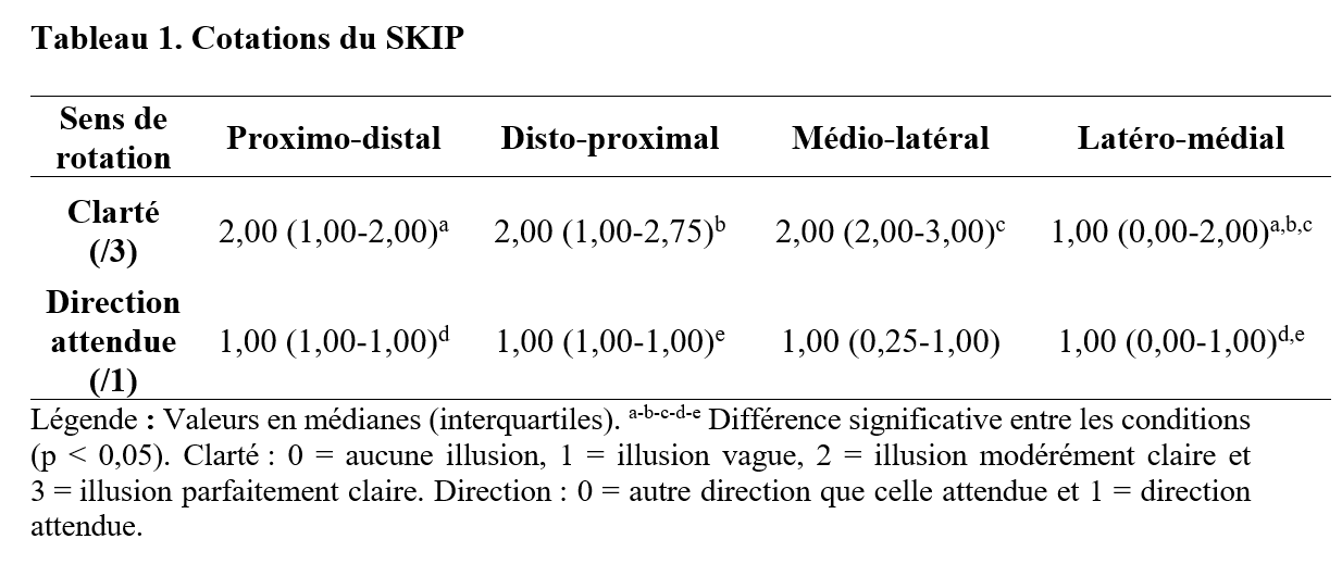 L’échantillon étudié (7 hommes et 13 femmes) était constitué de 16 droitiers et 4 gauchers âgés de 24 ± 3 ans. Les résultats démontrent que la rotation latéro-médiale induit des illusions significativement moins claires que les autres conditions (p < 0,02) et induit le moins souvent l’illusion attendue d’extension (tableau 1).