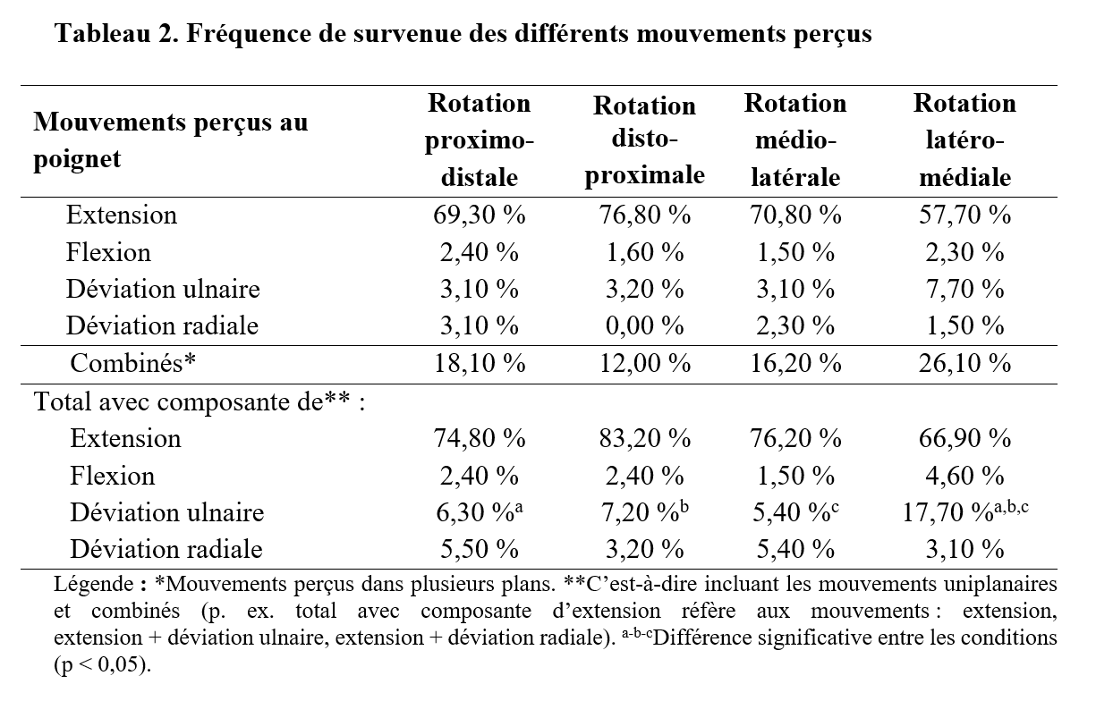 De plus, dans 26,1 % des essais, la rotation latéro-médiale a créé des perceptions de mouvements combinés, plus spécifiquement avec une composante de déviation ulnaire (17,7 %) comparativement aux autres conditions (p < 0,05) (tableau 2).
